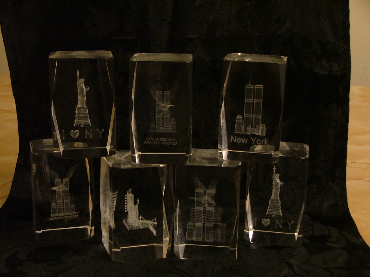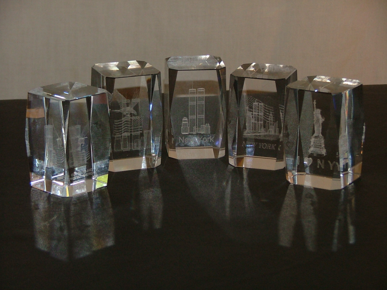 15 Piece Set In the 15 piece set there are "three different sets" of images based on "NewYork City" famous landmarks and statues.These 3" x 2"x 2" laser inscribed Crystal piece's are the perfect product if your looking to make cash. Each piece can be sold from $29-$49.99 serious buyers need apply only.These crystals sell themselves. |