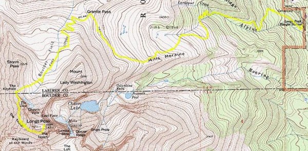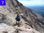 The Keyhole Route, Longs Peak's only non-technical hiking pathway, is a 16 mile round trip with an elevation gain of 4,850 feet. Though non-technical, the Keyhole Route is still challenging and is not recommended for those who are afraid of heights or exposed ledges. Hikers should be properly outfitted with clothing, food and water. Use caution when ascending or descending steep areas. Don't be afraid to back down when bad weather threatens.