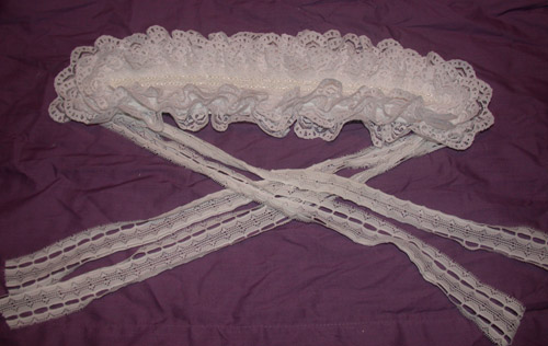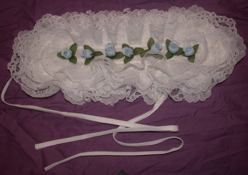 Theis adorable head dress is made form sturdy white fabric and topped with white frilly lace and baby blue rosebuds. Ribbon is sewn on either side to make it easier to attatch to your head. A darling addition to any EGL outfit.
