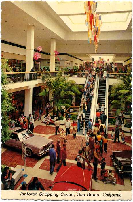 My research on the Center consisted of going to the San Bruno Library. There was a small summary of newspaper articles, and it seemed that this shopping center was despised by the neighbors for some time. They did not like the traffic, and they did not like the dilapidated condition of the center. It had a very odd configuration, with much parking in the back of the buildings. There is nothing left at the site to indicate that it was once a bustling (sic) community center, it was scraped clean for the apartments. A Shell gas station long stood where the Pacific Bay Vistas leasing office now stands. Former area resident Jim McMullin wrote us and adds about Fox Skyline Center: "U did not mention the hardware store That was next to the 5&10 Also Teds Shell was on the corner long before the shopping center was built. Teds tanks leaked for many years ,He found out when he wasnt getting the galions he paid for.Losing 800 -1000 gal a month.Think he finally had to sue Shell .That corner is a super fund site (i Think) and cant be built on for a very long time.Also there in a sewer line -Next to a water main that goes through there.One of them broke a few years back and caused a BIG problem.I watched the theater being bult.It was a tilt up(they pored it on the ground then lifted the pannels up) ...I moved about 6 months ago from Elston after 45 years.Antony from the area wrote: I lived on Summit Rd. over-looking the shopping center from 1963 to 1972. The fog was unrelentless! I recall kids--myself included--chewing (sic) on hunks of tar that were left over from the construction of the Fox theatre. I just hope it wasn't carcinogenic. My favorite shop was the cleaners where the owner, Jack, had a small scale model hobby shop at the front of the store. He showcased his finely crafted tanks, and warplanes in a glass display, behind which were stacked various kits for sale. When I was 11, I took 3rd place in the first model contest he gave--what a thrill!Personally, I spent most of my time in the early 80s in the "Prima Pizza" parlor. It was by then very dingee and falling apart. I dont remember the pizza as being that exceptional, but it wasnt that bad either. The guy that ran it was from Boston area, of Italian descent, I believe, he was quite a character. I also went into the Thrifty a few times, and the SkyHouse, once or twice. When I was very young I might have gone into the hardware store. Here you will find a collection of photos and things that pertain to the Center, I am sure that someone in their garage has color pictures of the center, if you do, please contribute them to this site, there are a lot of former neighbors and current inhabitants who remember the center and would probably dig seeing...if you have anything to add, or want to contact the author send to: foxskylineshoppingcenter@gmail.com Photographer Scot Boshmann took a lot pictures of some of the center before it was torn down wayy wayy back in 1986, he owns copyright on these two photos I have here below and generously granted me permission to put them here. He was able to get inside the theater and take pictures of the lobby, for instance. He did not take any pictures of the monument sign, the Skyhouse, the Shell station or the Thrifty building. I believe that he took the pictures for a newspaper piece on the demo of the center. Getting a hold of him was the culmination of a one year search to find any pictures of the center, calling the City, the current property owners, etc. ...so these are quite possibly the only pics in existence. So with all that said: Fox Skyline Center, Rest in Peace. Below: Shop spaces on S. side of property. To the left was a 30,000 s.f. +/- Grocery Store building. The shop spaces once contained the Pizza parlor, Ben Franklin 5*10, Beauty Shop, Barber Shop, Clothing Store. Beyond the movie theater in the background, to the right, was a small restaurant building and 20,000 s.f. +/- Thifty drug store space. The photomat was in between the strip of shops and the shell station, I believe.