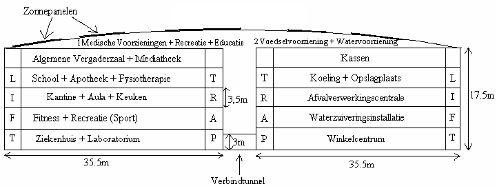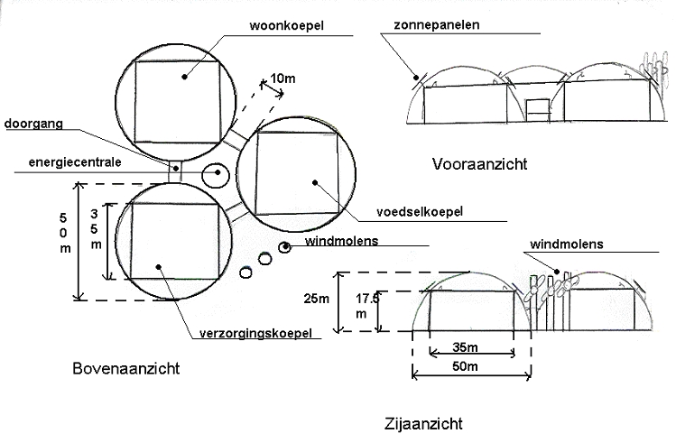 Om te wonen op Mars wordt gebruik gemaakt van koepels. Eerst laten we een indeling zien van de 3 koepels met haar verbindingen op Mars. Vervolgens laten we de indelingen zien van de 3 koepels zelf. Eerst de koepel waar de mensen in komen te wonen (woningkoepel). Dan de koepel voor de voedselvoorziening en vervolgens de koepel voor de medische voorziening.