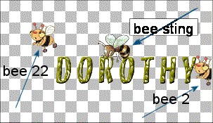 Move the text over to the very right of your canvas...deselect....Move the TEXT layer below the Bee 1 layer, making sure the Angry Bee is touching the letter to be stung...open bee 2 to judge where the bee is coming on to the canvas......open angry bee to see what letter he will attack..I had to squeeze my name in so he could land on my letter...if you have to do the same just use the deform tool and squeeze your name in.. open Bee22 layer so you can be sure he is leaving your first letter. now move your text so it is right under the angry bee..like so