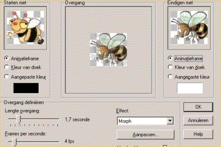 back in PSP click on angry bee and highlight it...then go to edit..copy...edit..paste as new image...click on angry bee...go to edit...copy... In animation shop right click on first frame(bee looking at you) and paste after current frame...click on frame one(bee looking at you)..to select it..now go to effects...insert image transition...with these settings