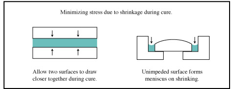 To minimize stress and provide long term stability, the lowest possible shrinkage is desirable. It is impossible to completely eliminate shrinkage. Fortunately, stress can also be minimized by the cure configuration discussed later in this paper.