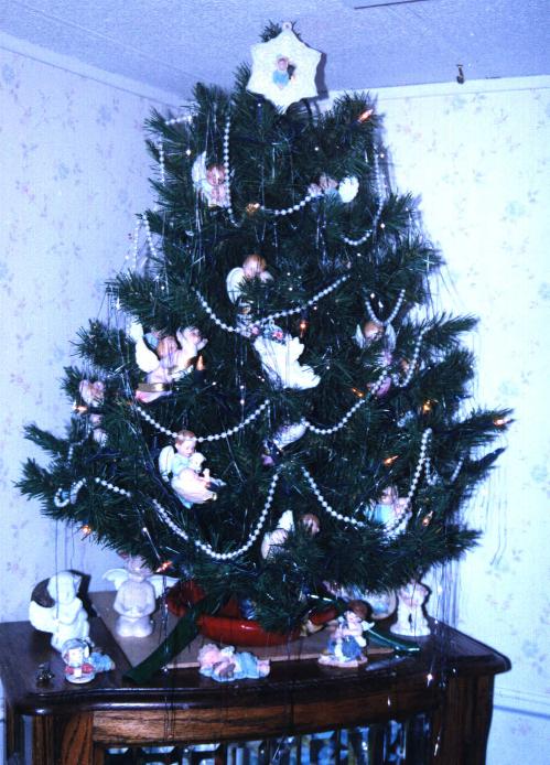 Christmas 1999 I set up a special "Taylor tree". This is the tree as it stands proudly in his memory. It has the "In His Image" (Ashton Drake) ornaments on it- with blue & white mini lights. This made me feel SO good!