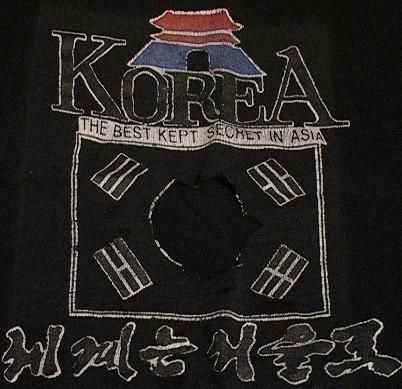 I found this cool shirt at value village excpet it was too big so I cut it into a patch but it doesnt read in english so i put it on my shirt upside down.. and I was bored of safety pins and thread so I used a ribbon to attach it.