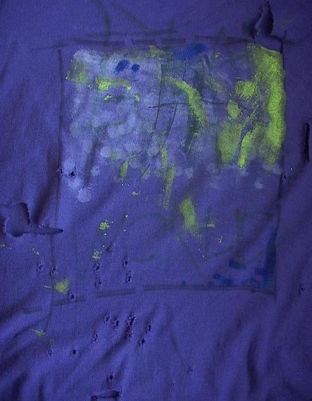 this shirt is actually purple, but it doesnt look that way in this picture. it says jackson hole and I wore it for like a week straight and then got bored of it so I turned it inside out and threw some sharpie and acrylics on it and attacked it with a knife.