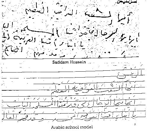 En el grafismo de Saddam vemos una forma de hacer menos adaptativa y diplomática, hay mas reserva, y la energía se concentra mas que se irradia. La voluntad de resistencia que lo caracteriza hace que persiga sus objetivos de una manera perseverante y paciente, no se deja llevar fácilmente por sus impulsos, pero si es muy reactivo cuando se siente atacado.