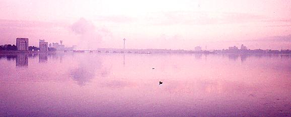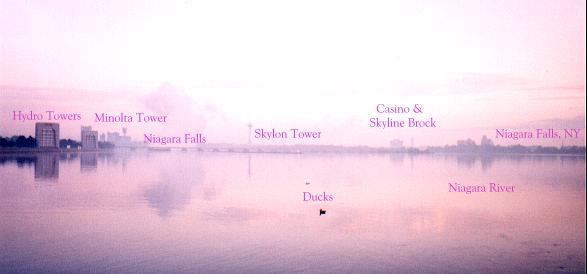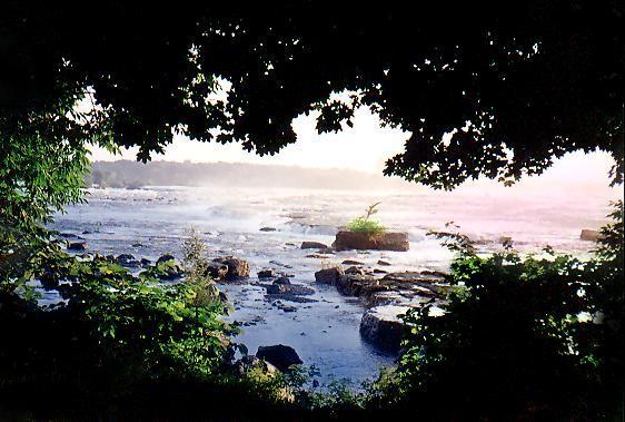Sunrise look at the Falls from upriver. The cloud on the left is the mist of the falls.