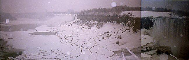 A composite of 2 pictures, with the American Falls on the left and Niagara Falls beginning on the right. Check out the snowpack on the river.