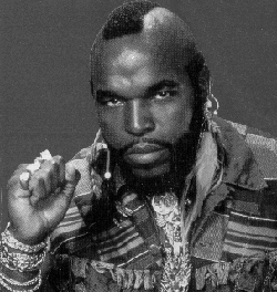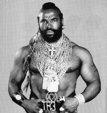 I was quite sincerely upset when I heard on the news last night that the one and only Mr.T had a form of Cancer (Lymphomia????). Anyway, on this page I would like to set-up some form of bits-n-pieces page on Mr.T. It will have no structure or set formula, Just a page of links, pictures, random thoughts etc. on anything about one of my childhood heroes.