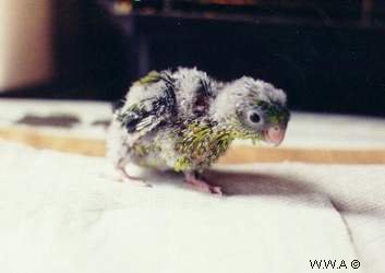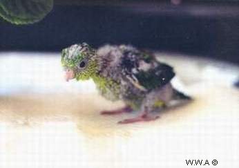 At 4 weeks of age, still needed to be fed about every 4 hours. Lots of pin feathers and the green colouring of an adult starting to show from the ends of the pin feathers. He is much more active at this stage. Can run and and even hop abit! Now he chases after the syringe when he is hungry, and even is starting to pick at some CEDE eggfood placed in a jar lid in the brooder.