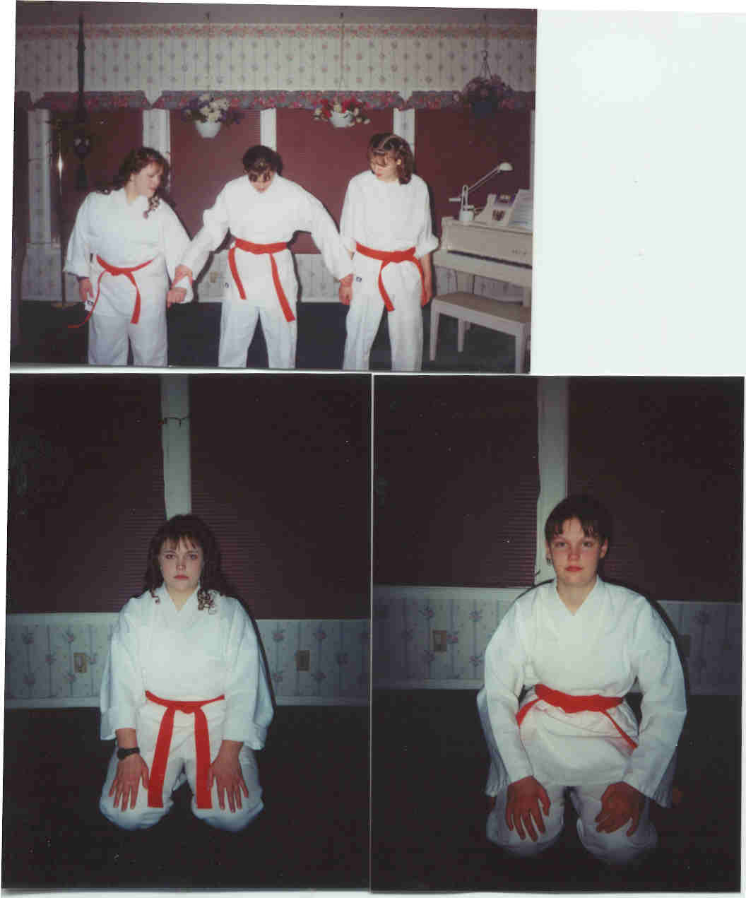 Ann, Debbie and Kristy goofing around in out karate gees, Deb was trying to show us something when mom took the pic.. so I don't know what to say about it!... Ann and Debbie in the relaxed sitting stance for listing..