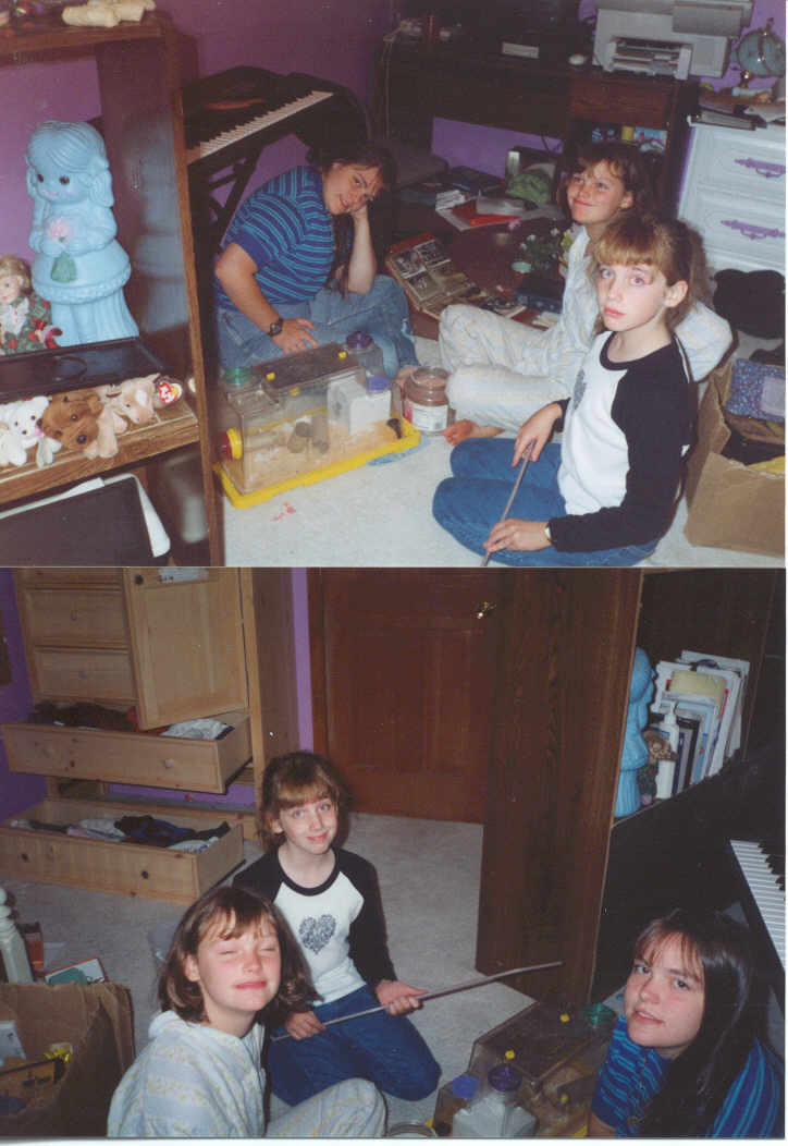 This is Ann, Debbie, and Amanda, in Kristy's room looking for a mouse that got out of the cage in the middle of the night. We had to take Kristy's room apart to find it.2000