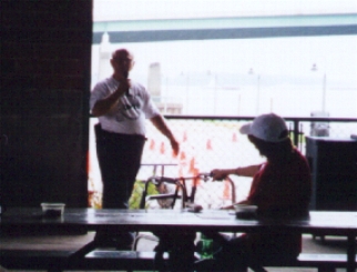 This is the beautiful view that we saw of the Mississippi River while we were getting ready for the bathtub races. You will see a tow boat pushing a long barge down under the Great River Bridge, joining Burlington with Gulfport Illinois. Steven lining up the course for the bathtub races and under the canopy to the right is D'Allen Rice, a entertainer who donated his services, preparing his sound system.