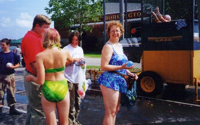 Doug enjoying the dunking as it cooled him off on the hot day. Dougs grandson with balls to dunk him but look what Bubbles and Becky have WATERBALLONS. That wasn't in the rules.