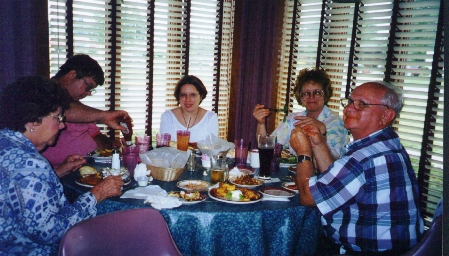 On Friday night some had arrived early and we went out for supper for our hot wings at Gators Restraunt. Above is Mattie "Mary", with Mark, and Becky, Bubblehead's family, and Doug and I .