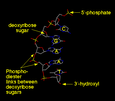 primary structure is the sequence of nucleotides of the nucleic acid. DNA contains a 5-carbon sugar (2' deoxyribose), a phosphate group, and a basic group on the 1'-carbon (cytosine, guanine, adenine, or thymine).