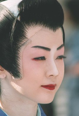 I flushed many pictures trying to do close-up photography with the many wonderfully dressed and white powdered geisha impersonators. But the results are amazing. I am proud of this picture (she is not the real Nene but I would call her my own little Nene, he he) and it is one of my best. The wig that she is wearing is not perfect I concede but nevertheless, her defiant eyes and the make-up details are effervescent of a long preparation for this festival. Please, remark the lipstick work is far from the outstretched Marilyn Monroe characteristic kiss and smack lips. |