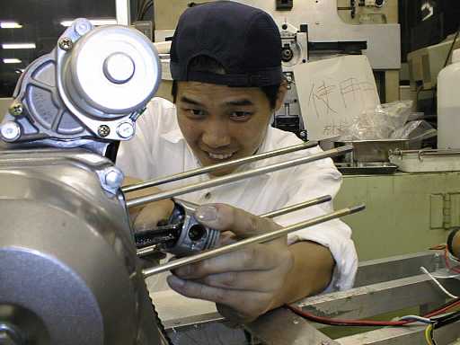 To the right: is Enya and Yamamoto working together on Aiming 3. This picture was taken a week before the event. Things had to speed up fairly rapidly around that time. Note the engine is wide open and connected to the different electronic devices and the battery.