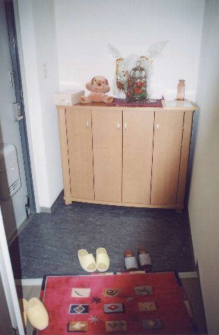 Right when you enter, there is a Japanese-style area where you're supposed to take off your shoes. There is also the "getabako" for you to put all of your shoes, and being the neat person I am, I always" put them in there. (Ha!) (getabako = box to put your geta which are sandals made of wood in the old times.) I'll admit that I've picked up the habit of not wearing my shoes into the house but soft sandals which are very comfortable. This is true except for those times when I forget something in the house,Then I walk on my toes with shoes on and come back in a hurry so that Kiyoka cannot see me. No wonder so many Japanese prefer slip-on shoes! You can see Kiyoka's favorite puppy named "Korokke" and many flowers that welcome our many guests. |