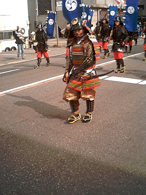 Another stage had been set up in the park and they marched in with fearsome martial music blaring out of the speakers which sounded like a Japanese version of Holst`s `Mars`. It all looked and sounded wonderful. Coordinators with walkie talkies moved amongst the 200 odd particpants and told them where to sit or stand for the ceremony. An announcer, also dressed in a classic Japanese tunic barked out a ceremony in a gutteral Japanese voice. A shogun was being crowned on stage. His white uniform with golden threads glittered in the bright sunshine. A dozen local male dignitaries, dressed in black suits, were also on stage to watch the proceedings and half of them made formal speeches afterwards. About what? Vote for me? I have no idea. The gruesone red samurai warrior then barked instructions to his infantry who sat with their rifles. They stood up in threes, walked forward, applied lit fuses to their gunpowder and fired off really loud explosions that had the old women and small children holding their hands over their ears.