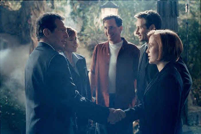 Comedian Garry Shandling plays Mulder and Duchovny's real-life wife Leoni plays Scully in a documentary about the X-files being made in Hollywood within the episode, and Mulder oversees the production (do the actors play themselves or other actors in the episode??): "I'm doing an X-Files episode in which I get to make out with Téa Leoni, David Duchovny's wife--I think you see my ploy," says Shandling, who claims that work usually interferes with his romantic life. "I'm doing that in the middle of March, in which I play the Mulder character in an X-Files film version, and David comes to see if it's being depicted accurately. I play him, and Téa Leoni plays Scully, and I make out with her. They're all good friends of mine."