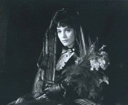 eyes, and pale skin. The contrast with her pale skin and dark hair make