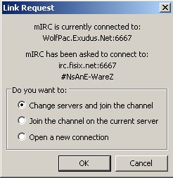 #7 Once you click the link to download the file, your irc client should open automatically and this option box should pop up. Choose the top option (the one selected in the screen shot) and click Ok. Note:: If you are already connected to a server and downloading a file, and want to start a new download. You have to pick "Open new connection".
