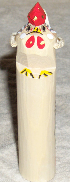 The chicken is really nifty. The tail feathers were made by splitting thin slivers up the body of the chicken and curling then. The splits are amazingly thin and uniform. The wing feathers are made of heavey splits.
