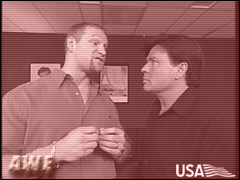 [[We return backstage where we see Jericho celebrating with his United States title around his waist, his steel chair in his left hand and Dawn Marie walking next to him, holding his right hand, as we listen in........]] Chris Jericho: WOOOOOOO....... I AM TRULY A LARGER THEN LIFE ROCK STAR!!! Dawn Marie: Hahaha... Chris that was great.... Chris Jericho: Dawn..... if Jeff Hardy thinks he has what it takes to fight me next week at Crash & Burn for MY United States heavyweight title, then he has another thing coming, because nobody will EEEEEEEEEEEEEEEEEEver take this belt away from me EVER! Dawn Marie: And if Lita thinks she's getting out of that Lingerie contest she is as crazy as her boyfriend Jeff Hardy. I'm going to embarrass her next week, and show to every single person out there that I AM THE HOTTEST, THE SEXIEST DEPUTY EVER! Chris Jericho: And maybe finally I'll get some respect around here..... Dawn Marie: Absolutely.... [[From there the two walk off together. what in God's name are these two doing together as a team? We fade backstage once more.....]] [[We go backstage inside Val Venis' dressing room, where he and Eric Bischoff stand. Venis looks RIPPED! Bischoff is standing there smiling from ear to ear.....]] Eric Bischoff: This is it...... the big return for the Envy of every wrestler......... VAL VENIS..... Val I got to hand it to you, you look GREAT!