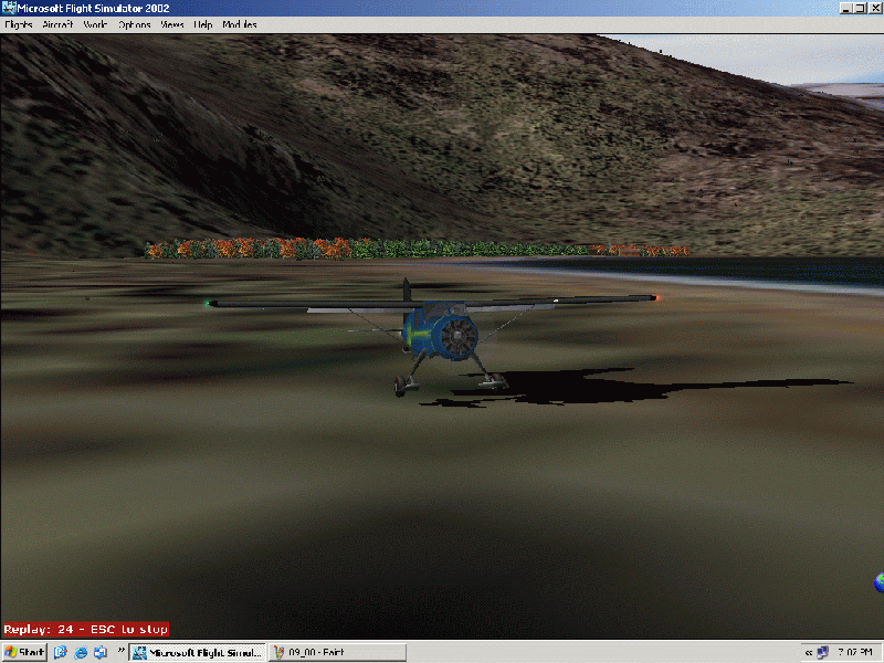 I made my initial approach, but couldn't get a good line-up on the short strip surrounded by trees. I slammed the throttle wide-open and went around. I tried again, and got the same result. I decided to land on the ground just beyond it, since I decided it wasn't worth damaging the plane to land in the trees. Here I am touching down a little bit beyond the runway.