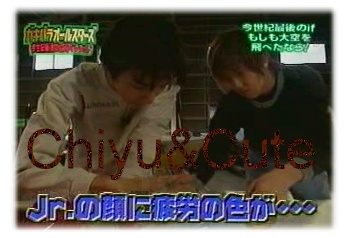 後記﹕雖然嵐很可惜的並沒有在預定的時間內達成連續 12 個全到的目標、但是在攝影機看不到的地方嵐一定也會繼續努力著的~ 這次為了做這個 Album Cute 一直重複看了好幾次 “痛苦”的地方~ 原本在電腦旁邊平靜的手、到最後都斗起來了、真是是十分另人感動的特別節目^__^ 在這裡要請大家原諒 Cute 居然在這邊做結束、非常對不起、連續兩天、 Cute 跟電腦都已經到極限了﹗(苦笑) Anyways 希望在 21 世紀裡 Junior&嵐會繼續發出屬於他們獨特的光芒~ Album Captured by Cute |