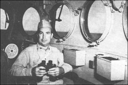 I got as comfortable as possible sitting in a chair in the captain's cabin. It was rather nice in there but very hot and stuffy as the ducts that supply air were shut down for general quarters. The Captain came in a few times to see that everything was functioning okay. Now the long wait started as hour after hour we steamed deep into Japanese territory. It was deathly quiet in the cabin as there was little noise on the bridge and even that did not trickle into my location. The cabin was nice and neat with the customary pictures of the wife, etc.