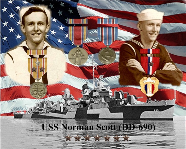 The picture shown above was received at this site in August of 2007 and was prepared by Wayne VanDerVoort of Altamont, N.Y. to honor his father, Henry VanDerVoort (S1c) who was a sailor on board the USS Norman Scott (DD-690). Wayne states that the flag used in this picture and the one that he made for me flies over the grave site of Uncle Sam (Samuel Wilson). The ship shown above was named to honor Admiral Scott who was killed in the Battle of Guadalcanal.