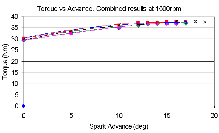 Figure 4.3. Torque vs. Spark advance. Combined results at 1500rpm 22