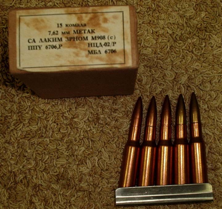 The M91/30 rifle is in 7.62x54r caliber. The "r" stands for "Russian" or "rimmed," depending on who you ask. This round is relatively hard to feed from a box magazine, mainly because of its rim and heavy taper. Despite this drawback it has been in service, with different loadings, for over 100 years. The original cartridge for the Mosin Nagant rifles was the 1891 cartridge which was a relatively blunt-nosed ball round. It was also relatively heavy at 210 grains. This was typical or military rifle ammunition of the time. In 1908 the M908, or "L" round was introduced. This was loaded with a lighter 150 grain spitzer (pointed) bullet (pictured above). In 1930 the type "D" round was introduced. This fired a 180 grain heavy ball round and was likely the main issue round during WWII, although the M908 round was produced through the war. The round currently in service is the 150 grain LPS which has a steel core and a muzzle velocity of 2,850 FPS. These rounds are identified by a silver tip. The picture on the right shows a WWII-vintage issue box of M908 ammunition. The rounds are held together by a 5-round stripper clip for quick loading (click image for larger view). The image on the right shows the headstamp of the round.