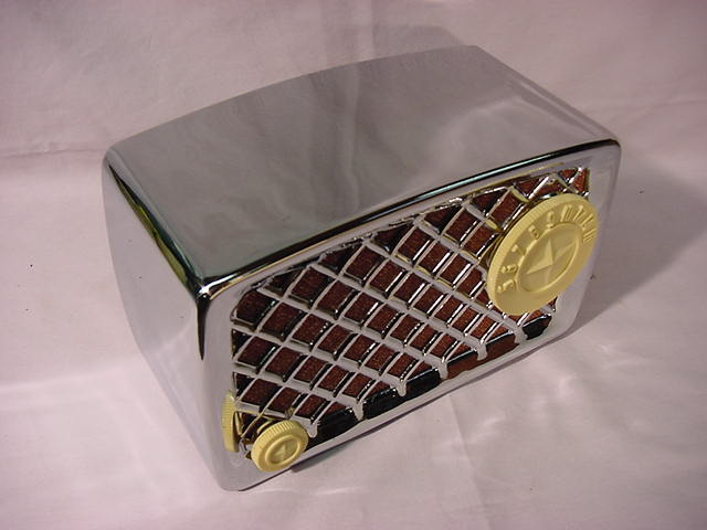 Daves Colorfull Radios Page 11Welcome to page 11 of Daves Colorfull Radios. Colorfull radios came in other types too. On this page I have a metal set,a novelty set,and a wood set. Metal was used back in the twenties and continued right along as the styles of radio changed. When radio sets came out in the 1920s they themselves were considered a novelty. It did not take long for home set builders and some manufactures to make some very novelty type sets. Wood sets took on some novel shapes from time to time and with the many types of wood they could be quite colorfull too. Pictured below is a Sears metal Chrome set. This small set looks like its from the late 1940s or early 1950s. I dont have the model number for this radio. I am going by the style and the dial. Sure is a shinning example of a chrome set!