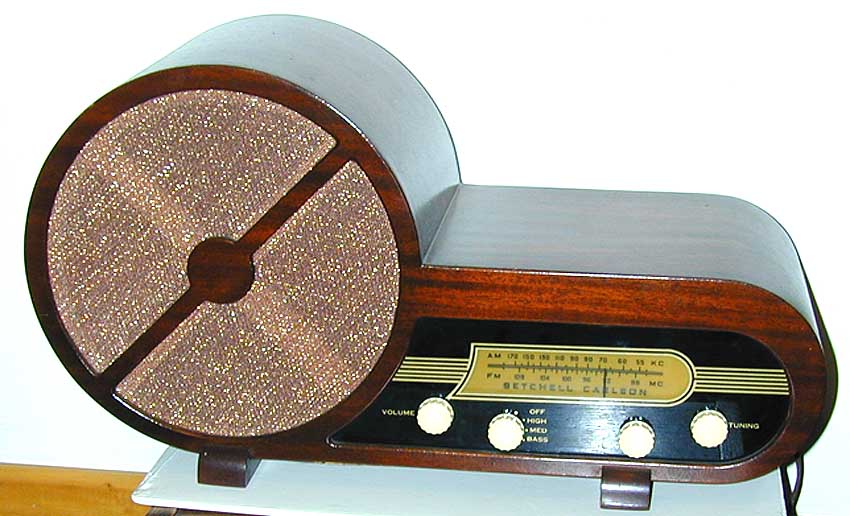 Rudolphs popularity grew to the point that in 1949 Wards offered this novelty radio for the Christmas season. The radio is colorfull. For the radio collector the verse would go; Rudolph with your dial light shines so brite would you guide my sleigh tonite! The Setchell Carlson radio pictured below ia a nice looking am/fm radio. The style is nice with the big round speaker and the gold dial accent is also nice. The blending of the stains is a nice touch too. Click here to go to page 12. Click here to go back to page 10 of Daves Colorfull Radios. Click here to go back to the homepage. |