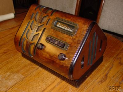 In 1940 Stewart Warner came out with the model 90-51 wood table radio. This is one of the most stylish wood table radios made in the pre war years of the 1940s. The triangle shape of the cabinet sets this radio right off. From this shape the radio's nick name comes from. Among the collectors it's nick name is The Ace of Spades! The waterfall grill design starts at the front and goes right over the top and down the back. The side grill work is the same on both right and left sides. The chassis bolts are shown in the side grills. Even the radio knobs are quite stylish. They have thin horizontil bars with a stylish sweeping S on them. The chassis is a superhet and receives standard broadcast only. I had one in my collection but I sold it 10 years ago. This is one set I wish I still had.