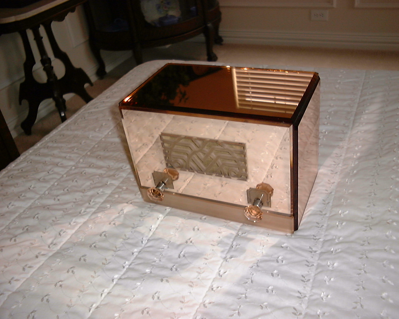 Sparton in the 1930s was the most well known manufacturer of mirrior glass radios. Well there was a regional maker in Los Angeles that made some nice mirrior glass sets. Hollywood Radio Company made this peach colored set pictured above. This set is stylish and has a nice look with the peach colored glass and chrome.