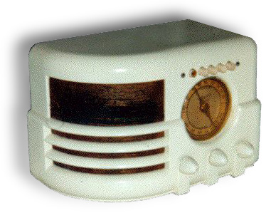 Pictured above is a Goodyear model 602b bakelite table set. This quite a stylish set with a waterfall style speaker grill. The little two tone gold airplane style dial is a nice touch also.