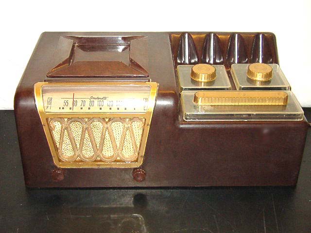 Here is a radio that served as more then a radio. This highly styled radio made by the Porto Company had a standard broadcast receiver and was also functional for the smoker in the home. There was to pipe rests for pipes. Storage compartments for tabbaco pouches. A place for a lighter or change etc. This set would be right at home next to dads chair in the livingroom or den.