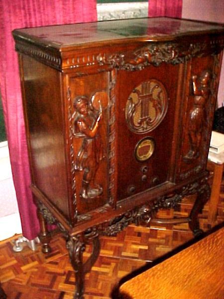 E H Scott was the real Rolls Royce of Radio. Even his battery type sets from the 1920s were of the highest quality and held reception distance records for years. During the 1930s Scott kept the same high quality and offered many custom cabinets for his radios to be put into. The one above is the fanciest I have come accross so far. Notice there is a small clock down in the front lower piece.