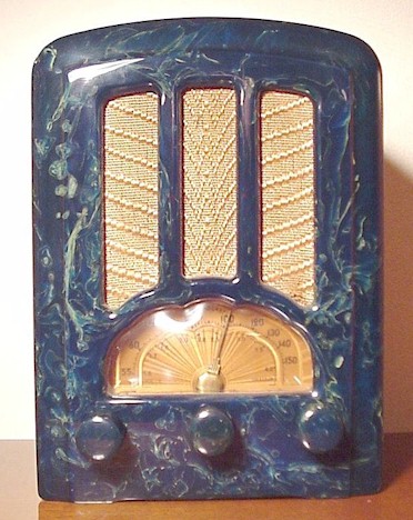 Daves Colorfull Radios Page 6Welcome to page 6 of Daves Colorfull Radios. During the 1930s the plastic industry grew by leaps and bounds. The different types of molds grew rapidly also. One of the new plastics was Plaskon. This phenolic resin poured and cooled very quickly. More colors could be made with this resin. Also marbleizing or the swirling was more pronounced when done. The advantage of Plaskon over Catalin was that it did not need the hand polishing as part of the process. Over time Plaskon gets quite brittle and will crack or break quite easilly. On this page are some Plaskon and Catalin radios.