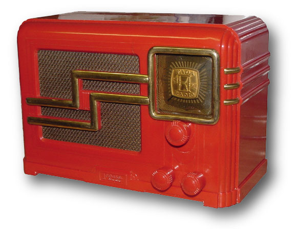 * * * * * * * * * * * * * * * * * * * * * * * * * Shown in the picture is a 1937 red and gold trimed Fada model 360 table radio. There are a lot of nice styling touches on this radio. The gold trim, angled side coloums and various embossing. The gold looked good with any of the colors offered on this small table set. This photo is used with permision from Classic Radio Gallery and is copywrited. To visit thier website click on the first link below. Click here to go to Classic Radio Gallery. Click here to go to page 7 of Daves Colorfull Radios. Click here to go back to page 5 of Daves Colorfull Radios. Click here to go back to my homepage. |