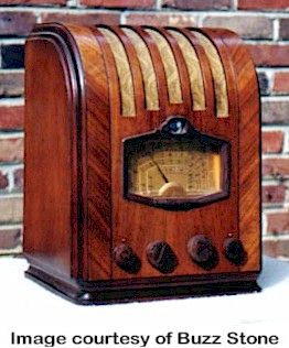 Here is another striking designed radio from Sears. This 1938 Sears radio has the sweeping waterfall styled speaker grill work along with a very attractive gold dial. Notice on the side in the front the sweeping tiger stripe venier. This adds color to this radio. This radio is a tall table set but is not a tombstone. I would like to have one in my collection! |