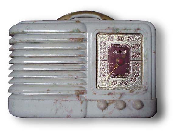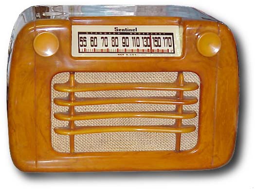 Daves Colorfull Radios Page 9Welcome to page 9 of Daves Colorfull Radios. On this page I did it a little different from the others. There is one wood radio, one Catalin plastic radio, and one beetle plastic radio. Enjoy the page. Pictured below is the 1941 Sentinel model 212 table set. There is some swatches of color in this plaskon radio. Notice too the top is shaped like a beetle. This name stuck to this style of radio. The other nice styling feature is the radios dial. Quite fancy. The photos of the Sentinel 212 and 284 are from Classic Radio Gallery. I have permision to use the photos which are copywrited. Please visit thier website by clicking on the link below.Click here to go to Classic Radio Gallery.