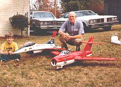 (above)1980 - Roger Geil and son with Rogers' two "Byron Originals" ducted fan jets. These two models flew very well indeed and had many flights under their belts.