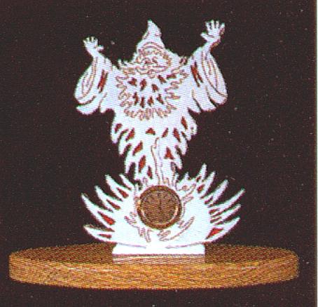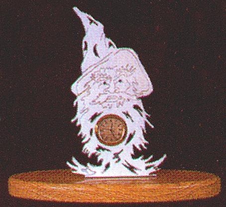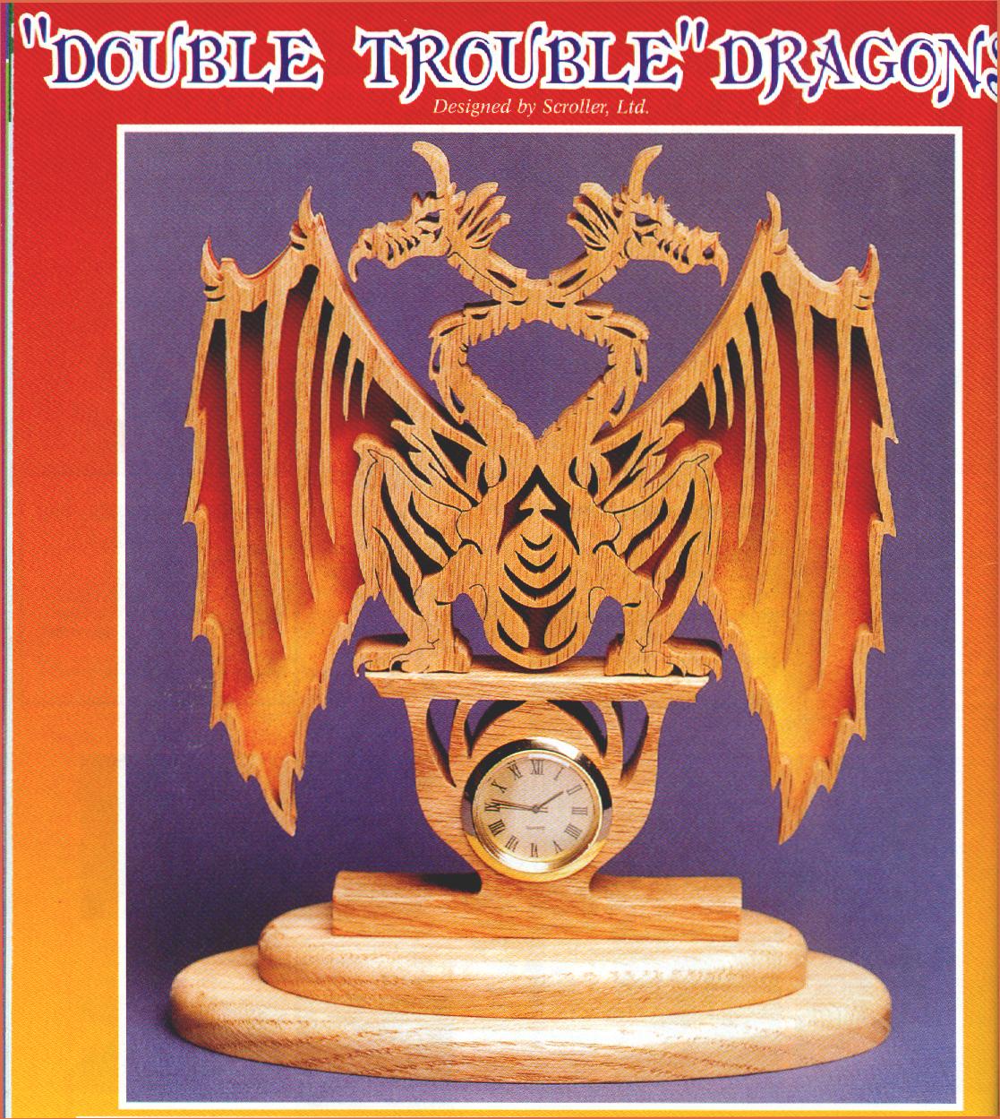 This Dragon Clock is made from oak. The dragon itself is 1/4" thick, the pedastal is 3/4" thick and the base is made of 2 pieces of 1/2" thick. The back for the dragon is 1/8" thick baltic birch and painted as shown. The rest is either stained in any color ordered or clear. The price is $50. This includes Shipping. |